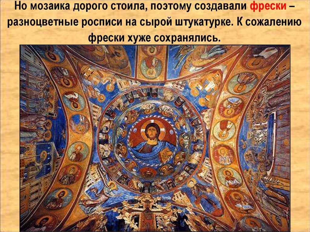 Но мозаика дорого стоила, поэтому создавали фрески –разноцветные росписи на сырой штукатурке. К сожалению