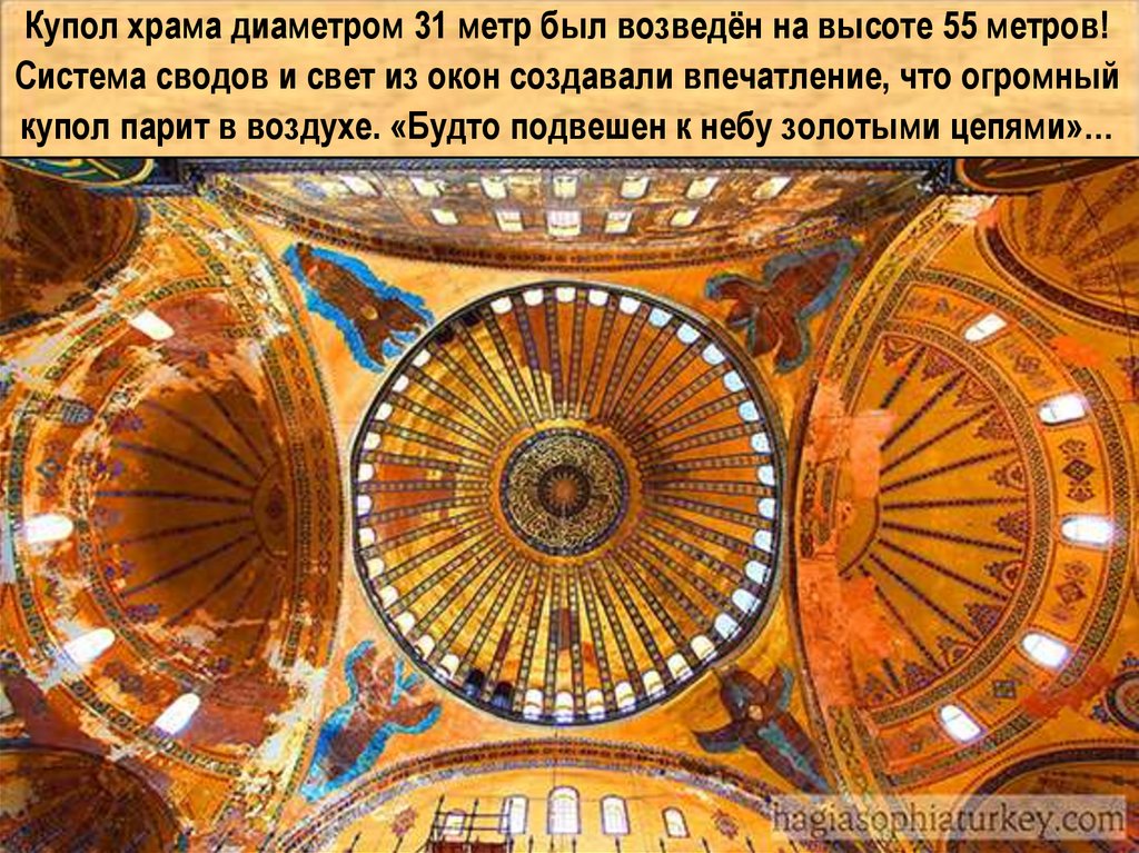 Купол храма диаметром 31 метр был возведён на высоте 55 метров!Система сводов и свет из окон создавали впечатление, что огромный
