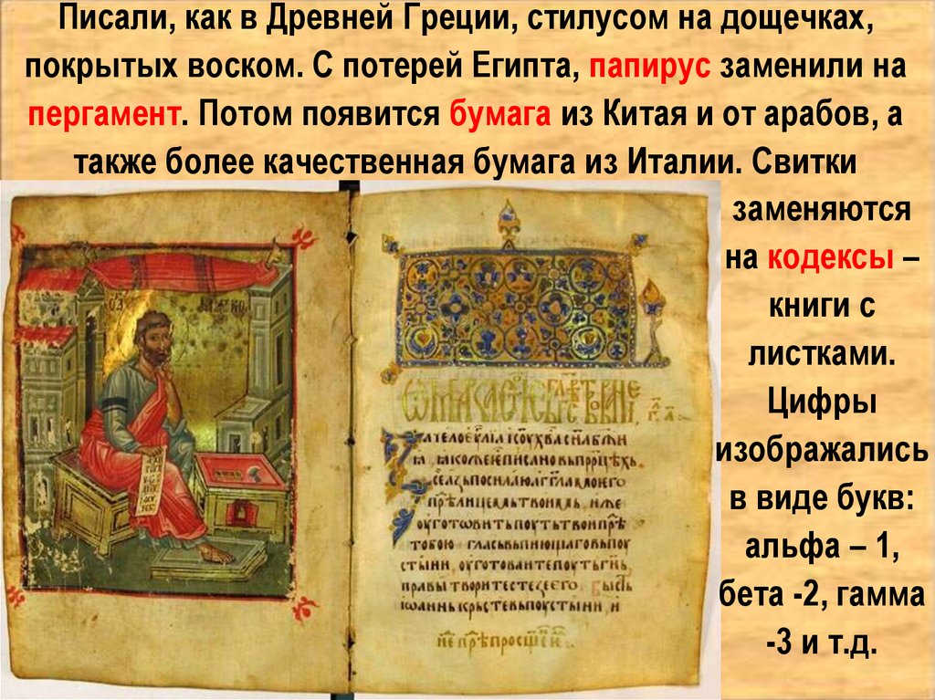 Писали, как в Древней Греции, стилусом на дощечках,покрытых воском. С потерей Египта, папирус заменили на