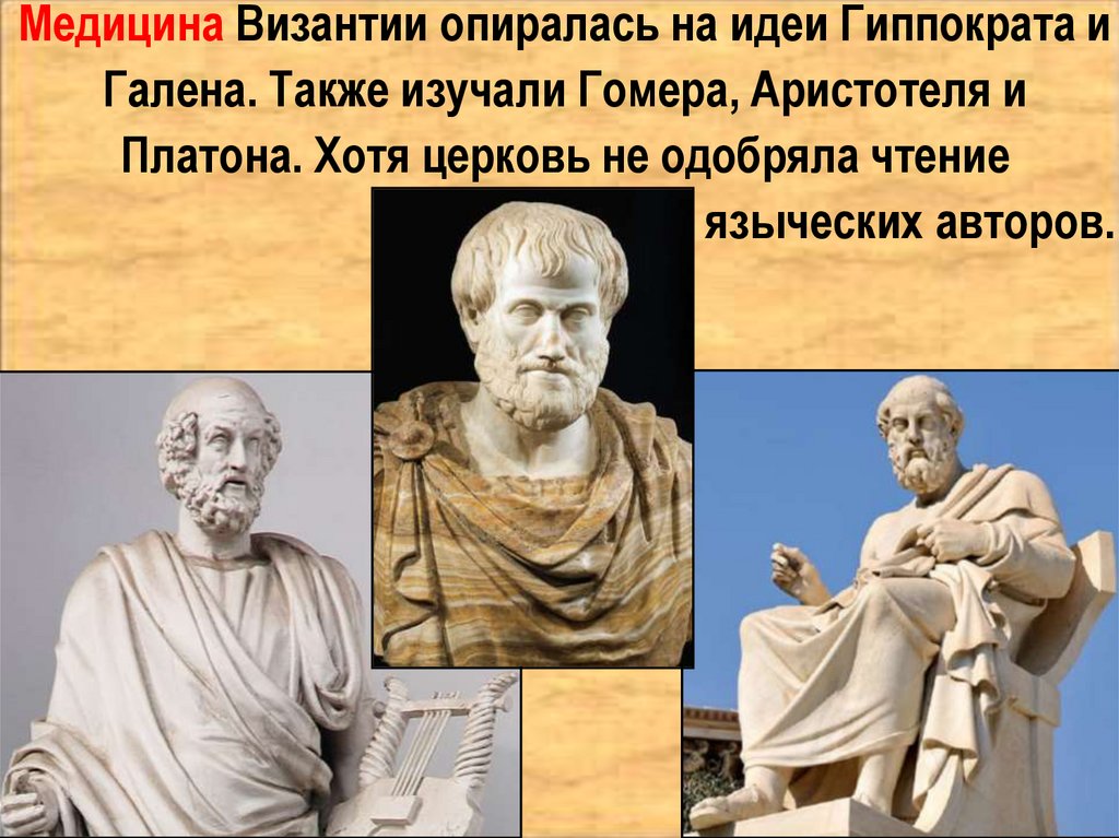Медицина Византии опиралась на идеи Гиппократа иГалена. Также изучали Гомера, Аристотеля и
