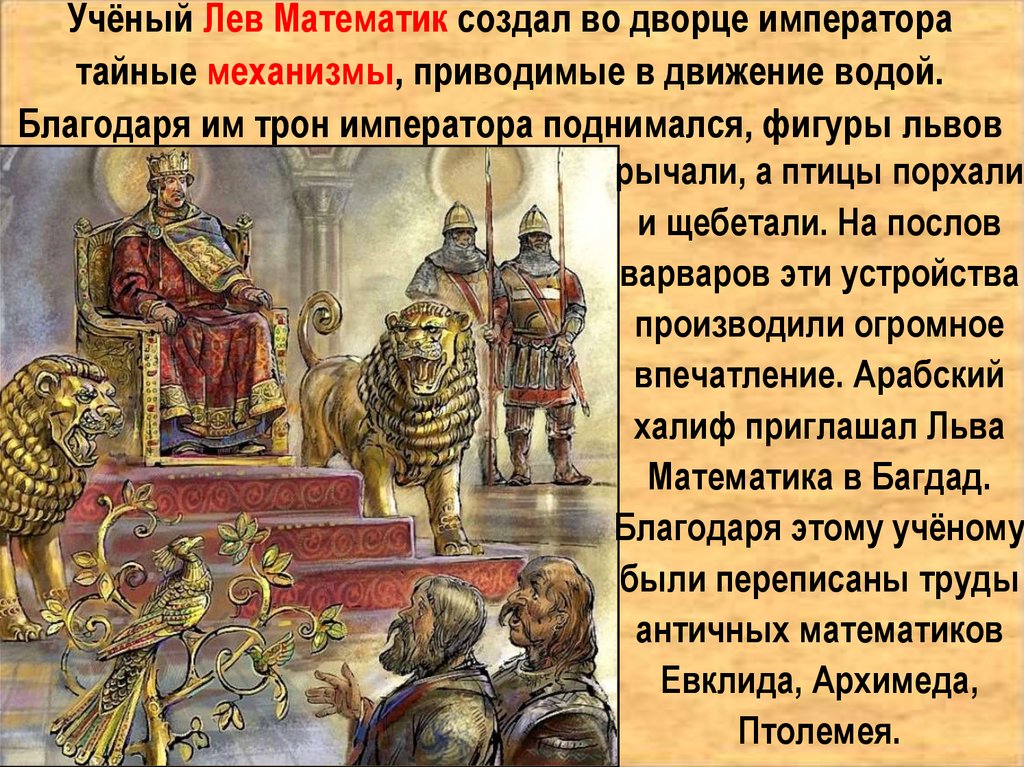 Учёный Лев Математик создал во дворце императоратайные механизмы, приводимые в движение водой.