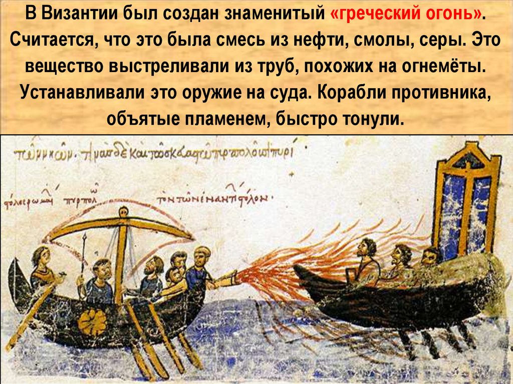 В Византии был создан знаменитый «греческий огонь».Считается, что это была смесь из нефти, смолы, серы. Это