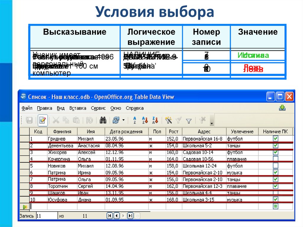 Условия выбора записываются в форме логических