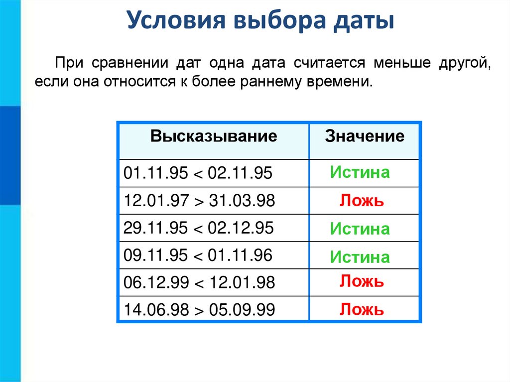 Условия выбора датыПри сравнении дат одна дата считается меньше другой,