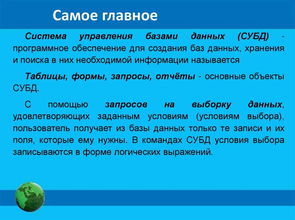 Самое главноеСистема управления базами данных (СУБД) программное обеспечение для создания баз данных, хранения