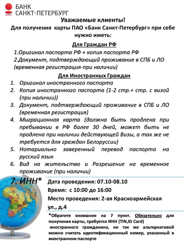 Уважаемые клиенты!Для получения карты ПАО «Банк Санкт-Петербург» при себе