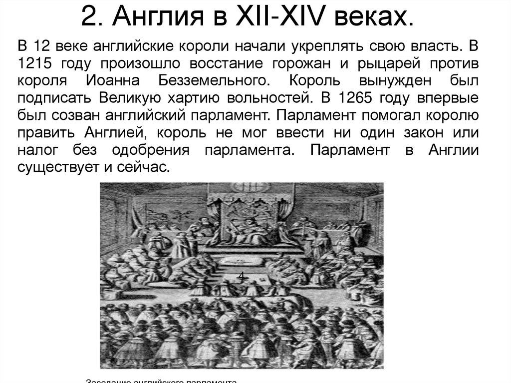 2. Англия в XII-XIV веках.В 12 веке английские короли начали укреплять свою власть. В