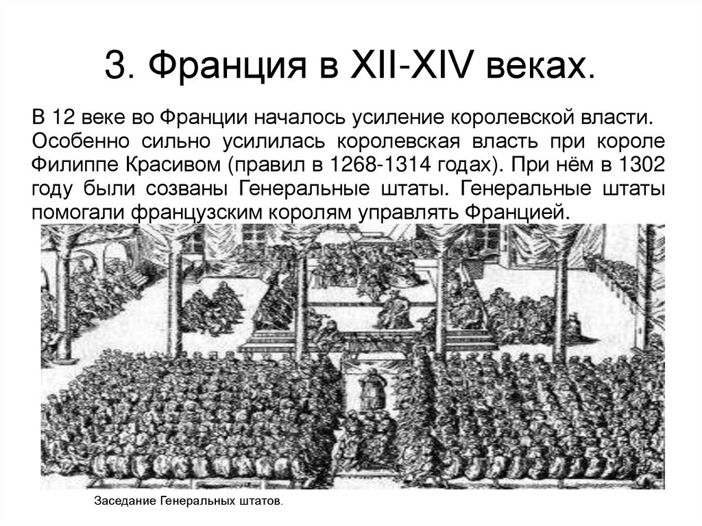 3. Франция в XII-XIV веках.В 12 веке во Франции началось усиление королевской власти.