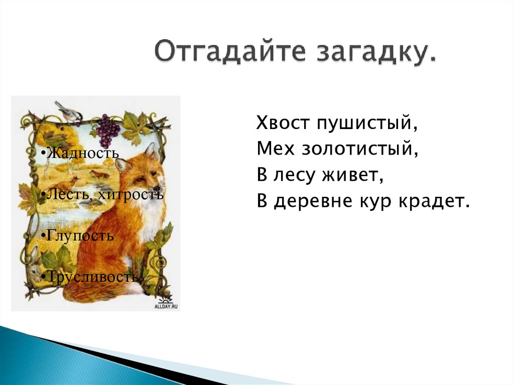•Жадность•Лесть, хитрость