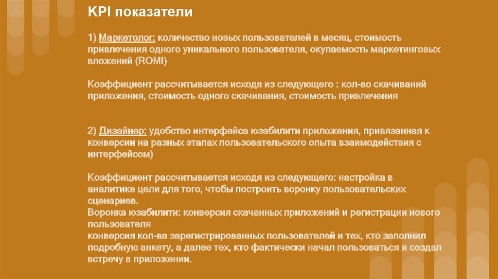KPI показатели1) Маркетолог: количество новых пользователей в месяц, стоимость