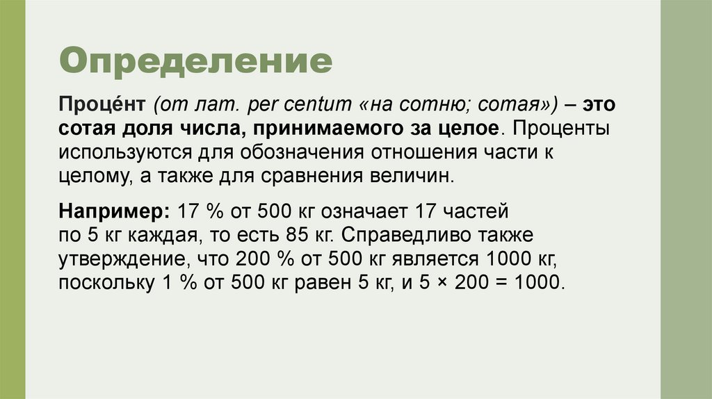 ОпределениеПроце́нт (от лат. per centum «на сотню; сотая») – это