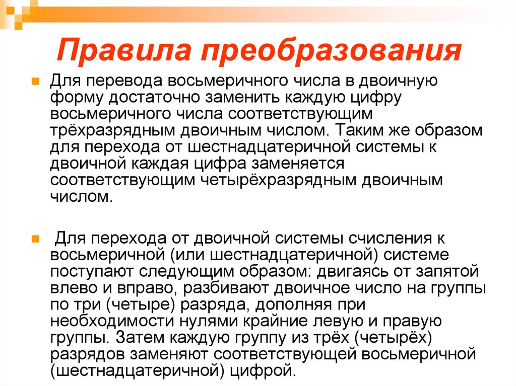 Правила преобразованияДля перевода восьмеричного числа в двоичную