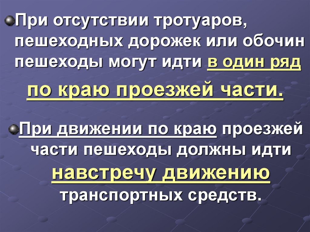 При отсутствии тротуаров,пешеходных дорожек или обочин