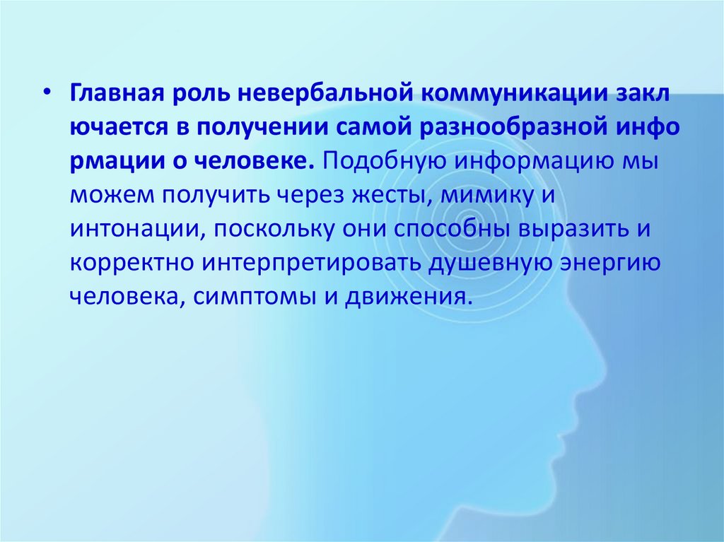 • Главная роль невербальной коммуникации заключается в получении самой разнообразной инфо