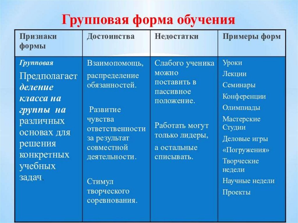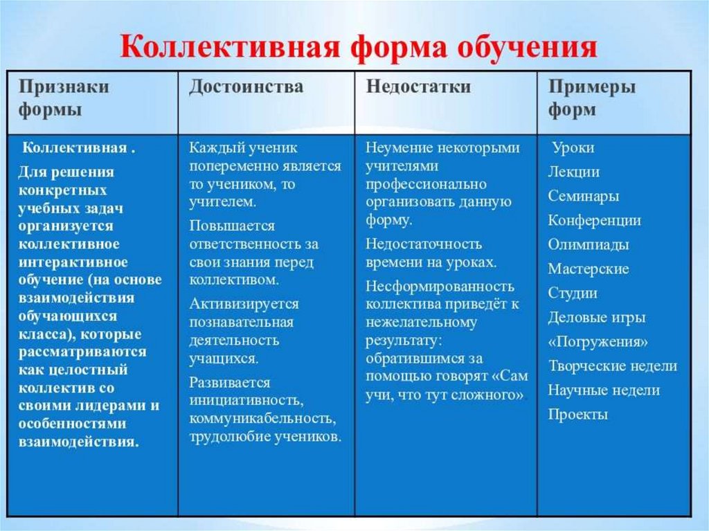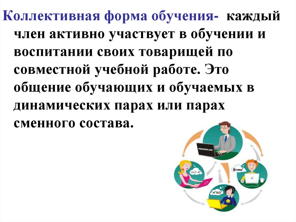 Коллективная форма обучения- каждыйчлен активно участвует в обучении и