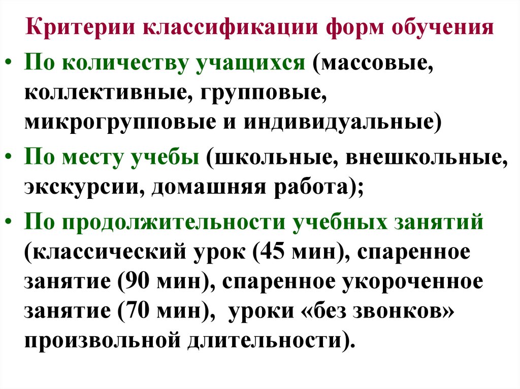 Критерии классификации форм обучения• По количеству учащихся (массовые,