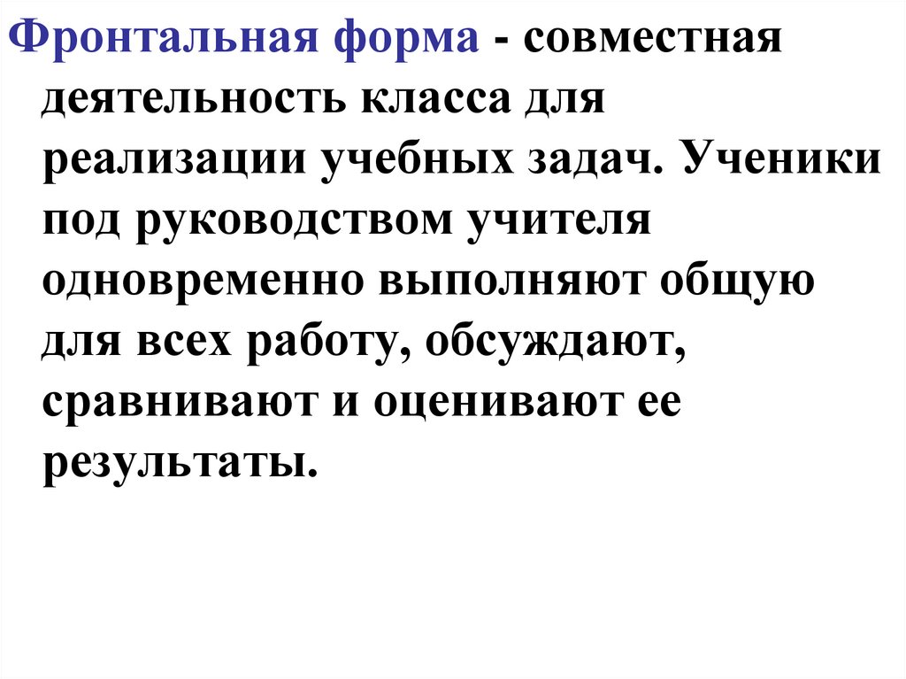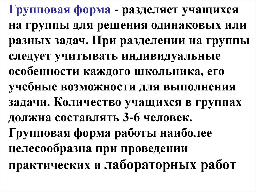 Групповая форма - разделяет учащихсяна группы для решения одинаковых или