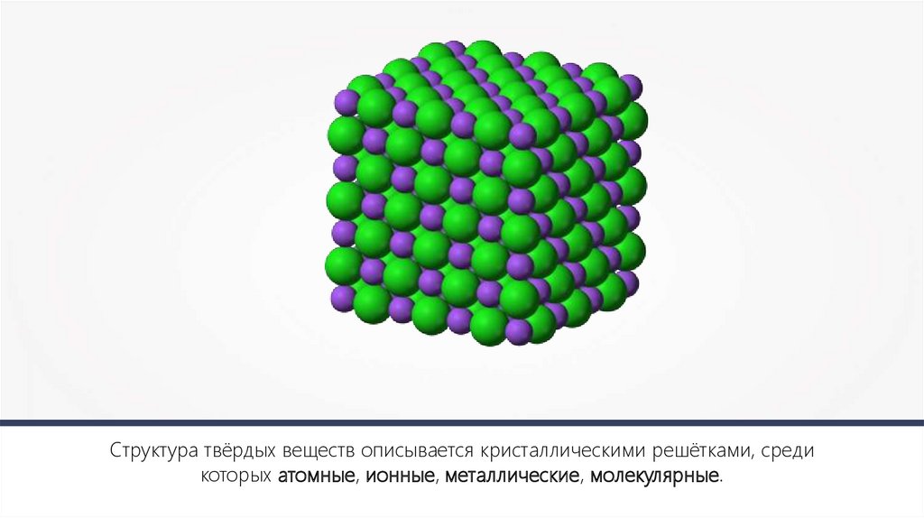 Структура твёрдых веществ описывается кристаллическими решётками, средикоторых атомные, ионные, металлические, молекулярные.