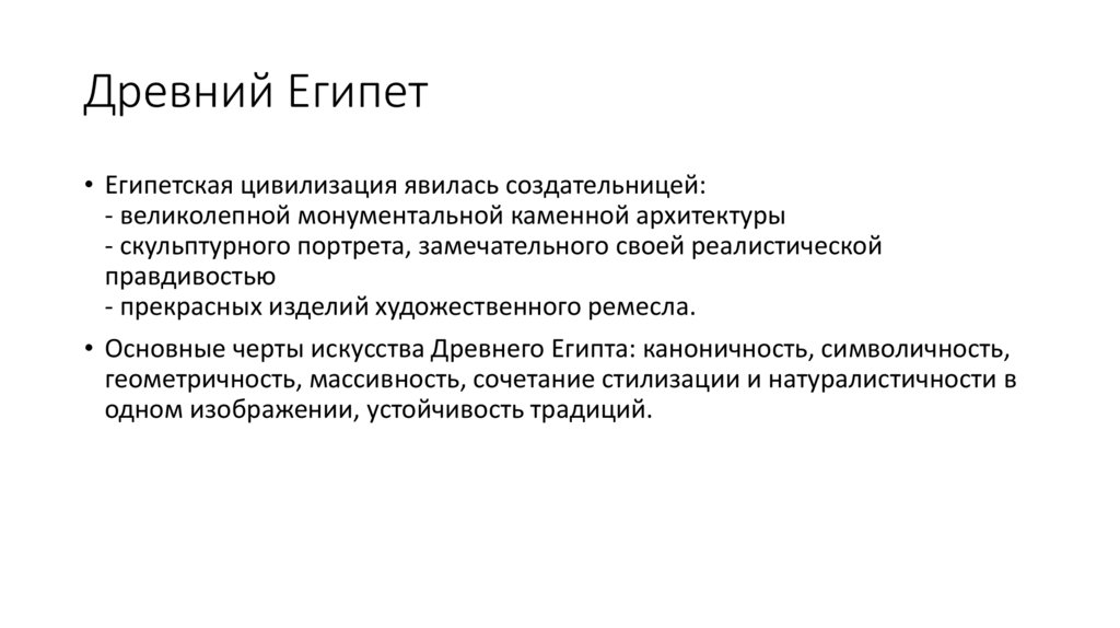 • Основные черты искусства Древнего Египта: каноничность, символичность,