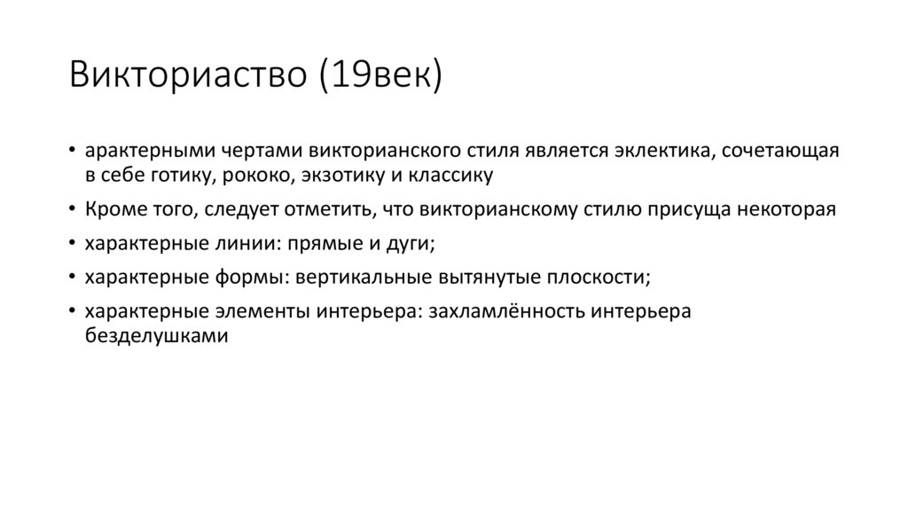 Викториаство (19век)• арактерными чертами викторианского стиля является эклектика, сочетающая