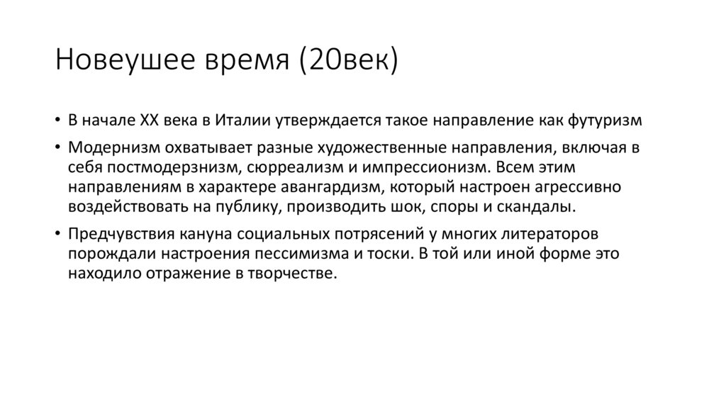 Новеушее время (20век)• В начале XX века в Италии утверждается такое направление как футуризм
