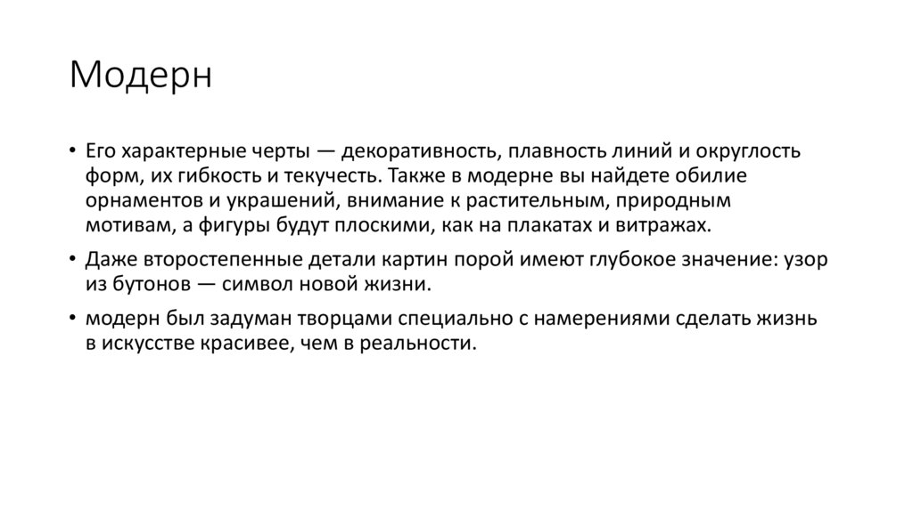 Модерн• Его характерные черты — декоративность, плавность линий и округлость