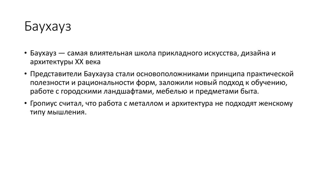 • Гропиус считал, что работа с металлом и архитектура не подходят женскому