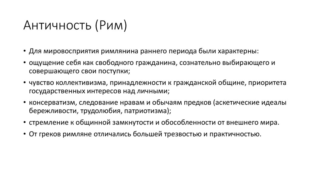 Античность (Рим)• Для мировосприятия римлянина раннего периода были характерны: