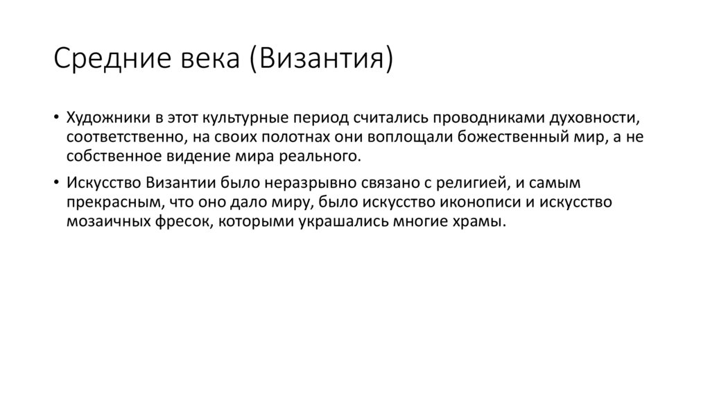 Средние века (Византия)• Художники в этот культурные период считались проводниками духовности,