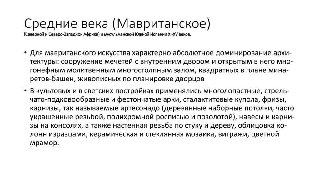 Средние века (Мавританское)(Северной и Северо-Западной Африки) и мусульманской Южной Испании XI-XV веков.