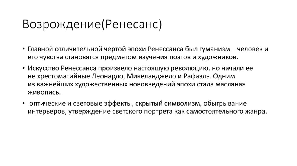 Возрождение(Ренесанс)• Главной отличительной чертой эпохи Ренессанса был гуманизм – человек и