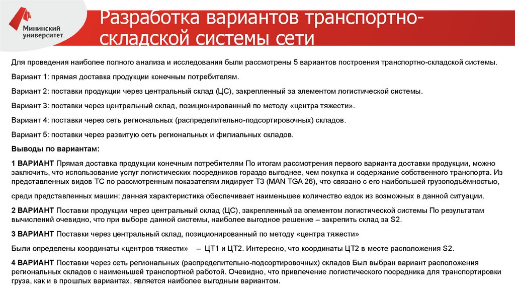 Разработка вариантов транспортноскладской системы сетиДля проведения наиболее полного анализа и исследования были рассмотрены 5 вариантов построения транспортно-складской системы.