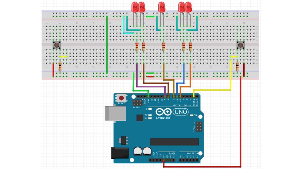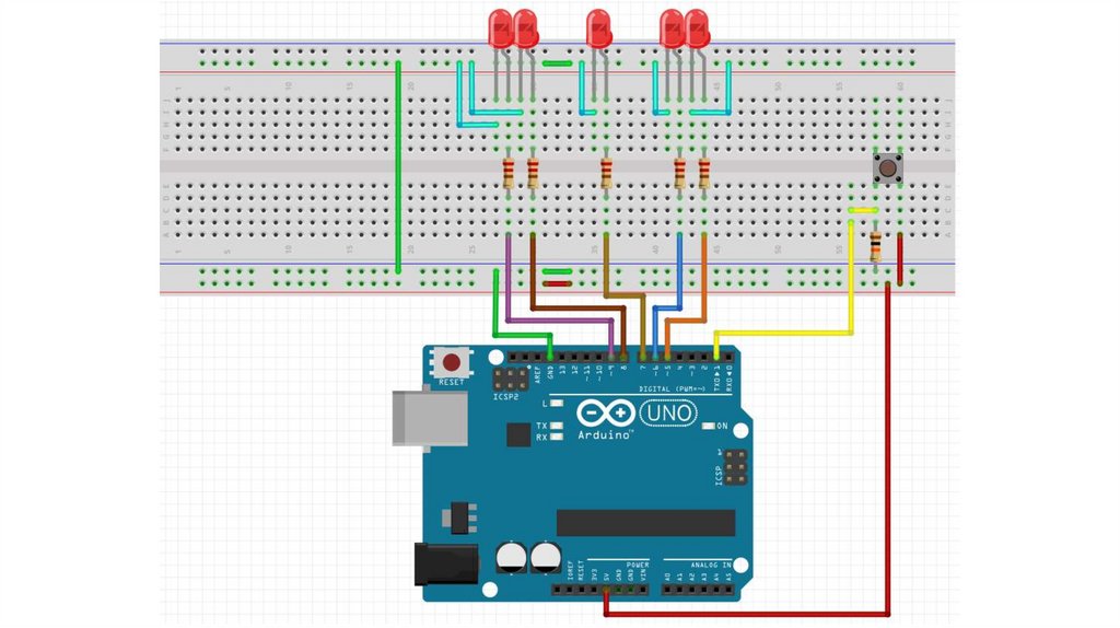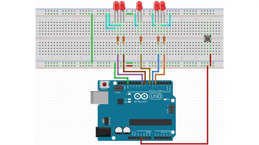 Игра• Из пяти светодиодов зажигать только один, остальные гасить.