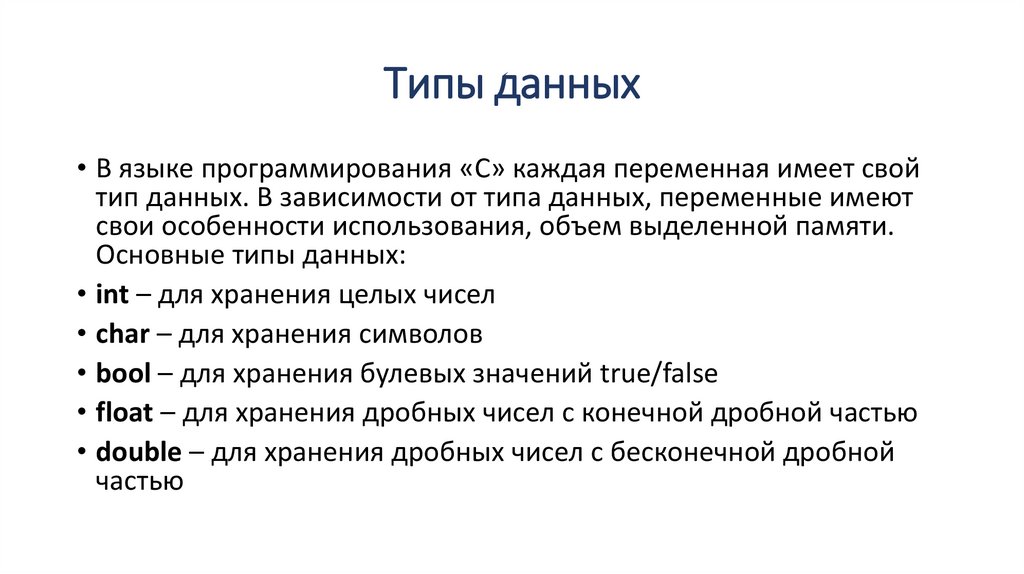 Типы данных• В языке программирования «С» каждая переменная имеет свой