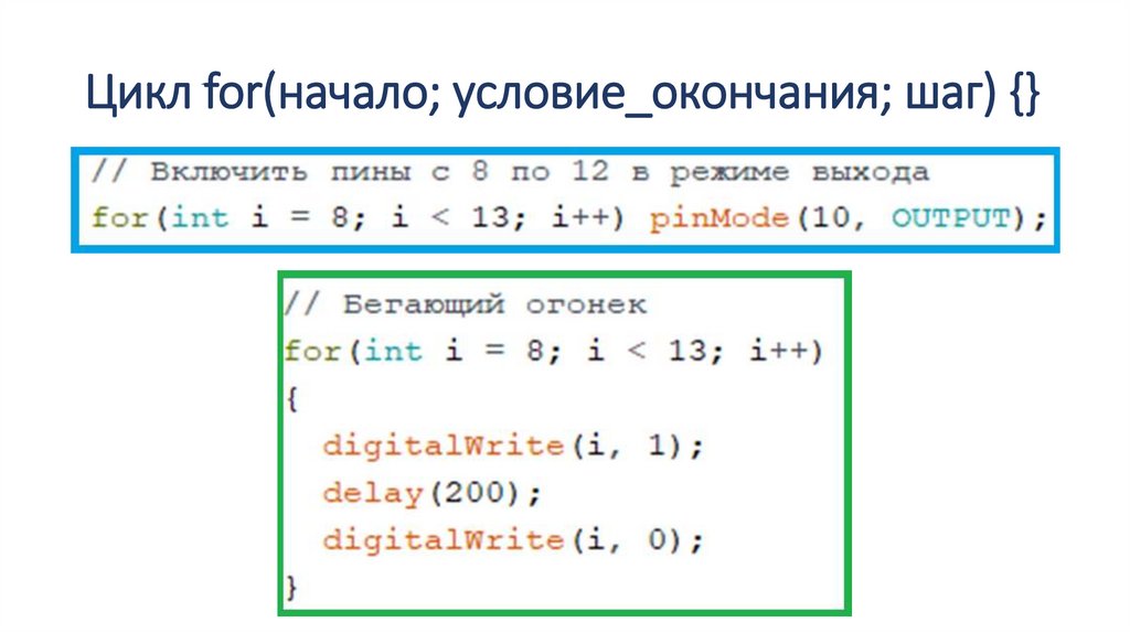 Цикл for(начало; условие_окончания; шаг) {}91.