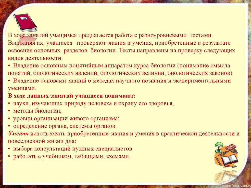 В ходе занятий учащимся предлагается работа с разноуровневыми тестами.Выполняя их, учащиеся проверяют знания и умения, приобретенные в результате