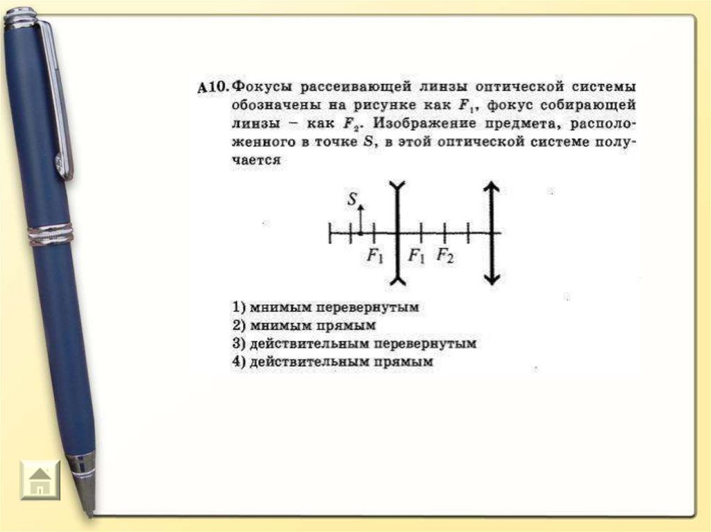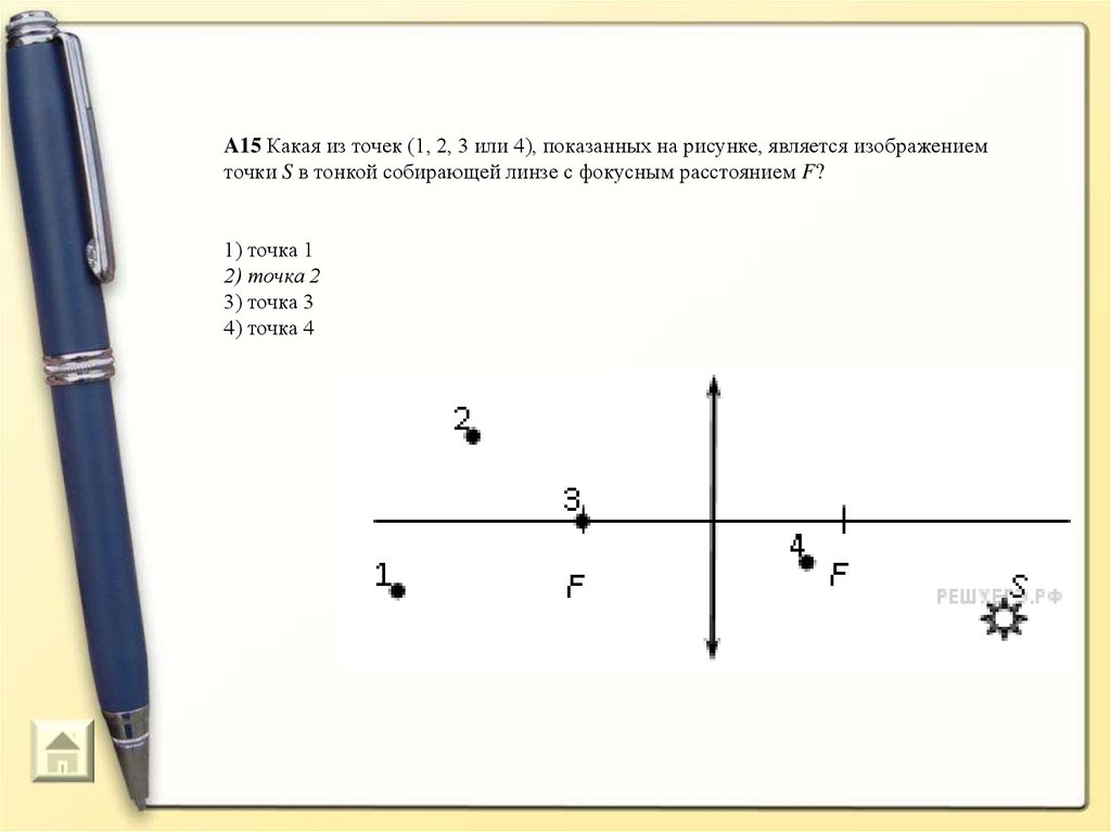 A15 Какая из точек (1, 2, 3 или 4), показанных на рисунке, является изображениемточки S в тонкой собирающей линзе с фокусным расстоянием F?