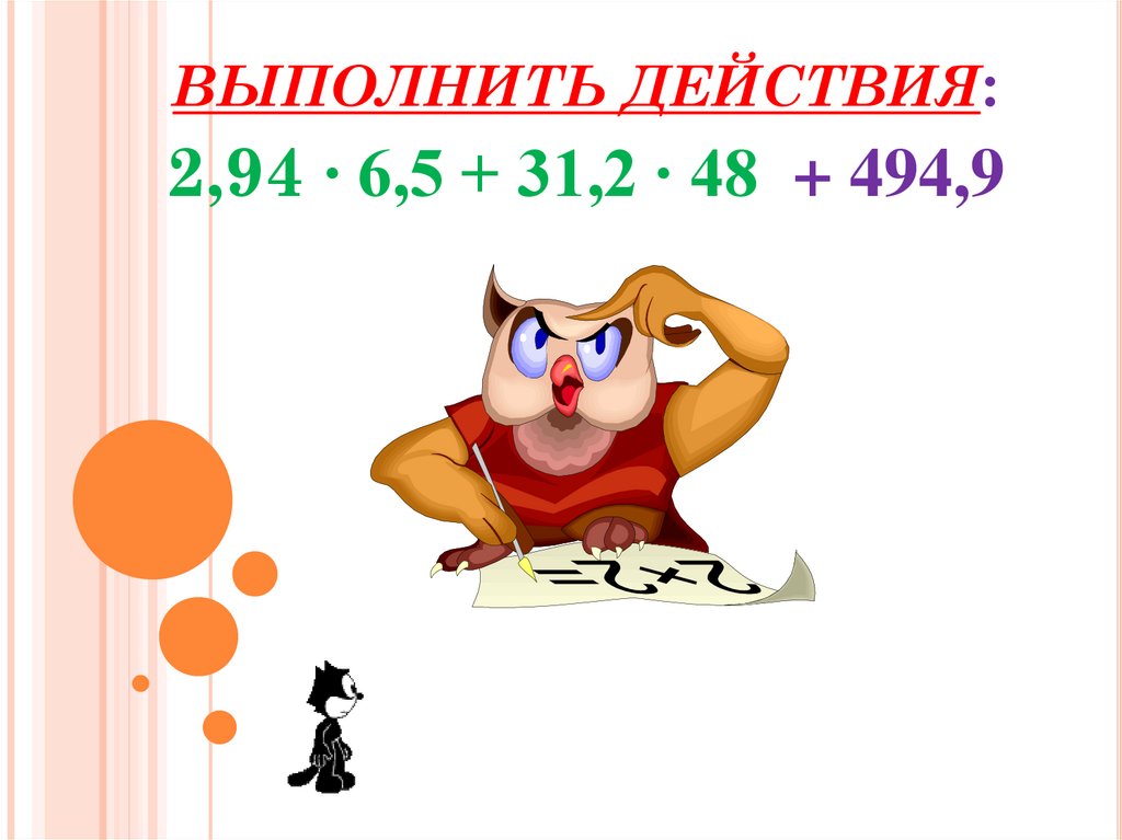 ВЫПОЛНИТЬ ДЕЙСТВИЯ:2,94 ∙ 6,5 + 31,2 ∙ 48 + 494,9