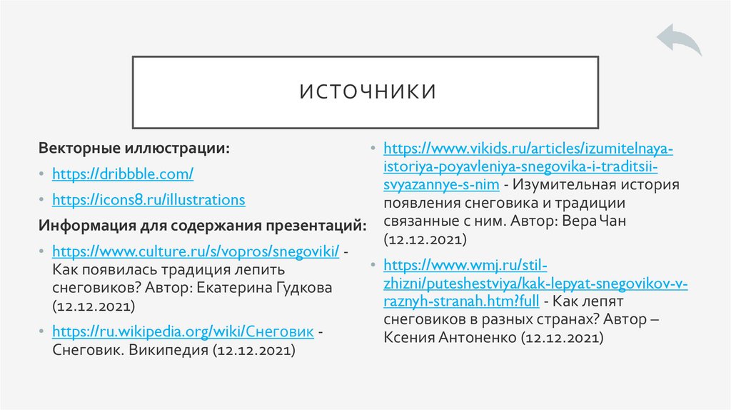 ИСТОЧНИКИ• https://www.vikids.ru/articles/izumitelnayaistoriya-poyavleniya-snegovika-i-traditsii• https://dribbble.com/