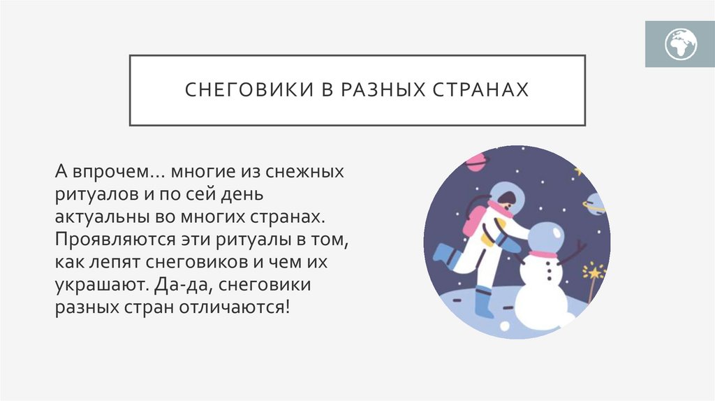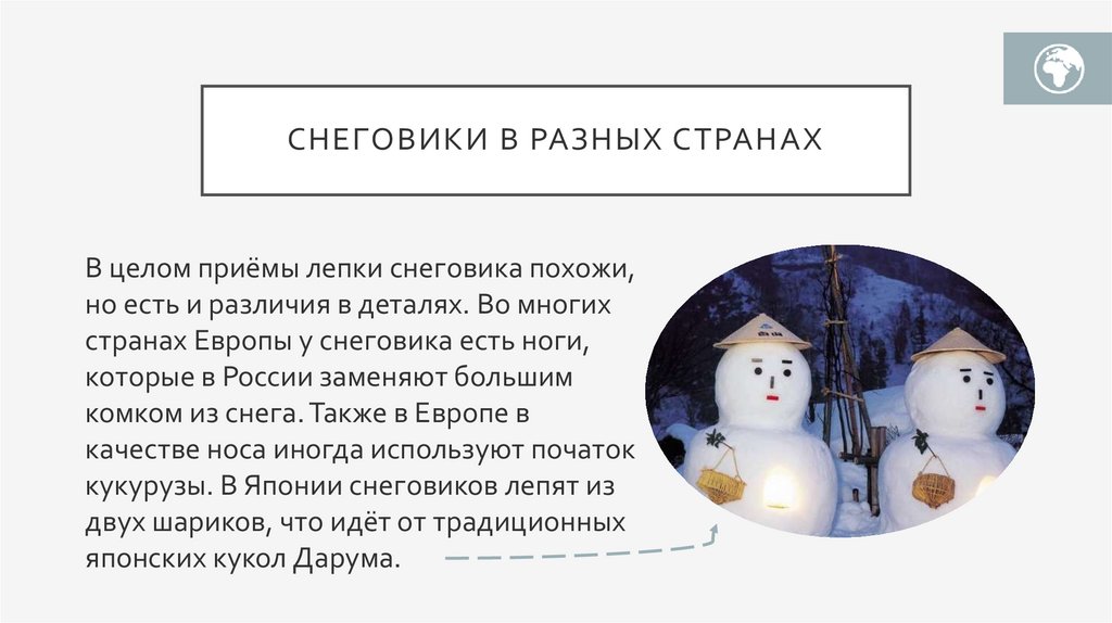 СНЕГОВИКИ В РАЗНЫХ СТРАНАХВ целом приёмы лепки снеговика похожи,