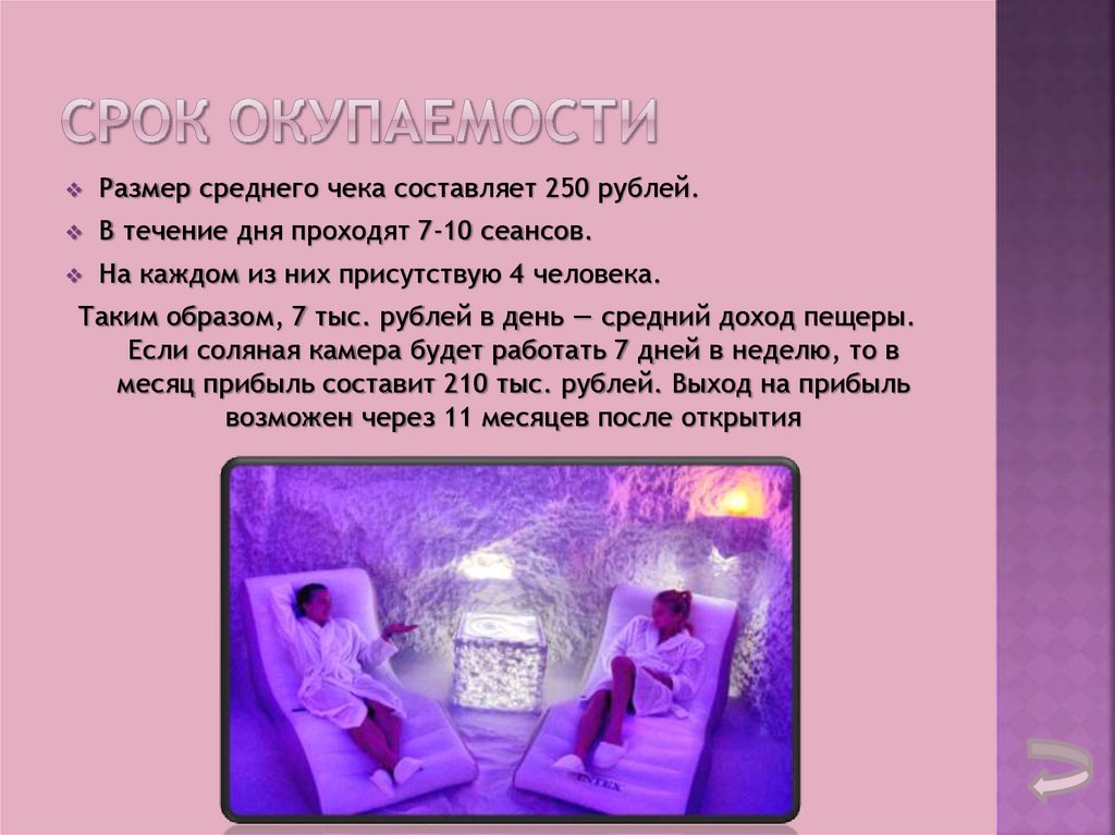 Размер среднего чека составляет 250 рублей.В течение дня проходят 7-10 сеансов.