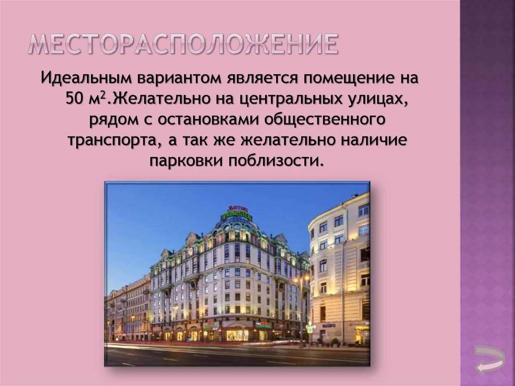 Идеальным вариантом является помещение на50 м2.Желательно на центральных улицах,