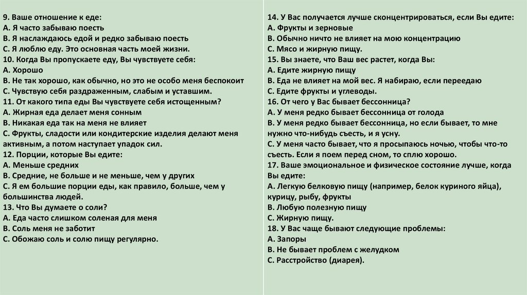 9. Ваше отношение к еде:A. Я часто забываю поесть