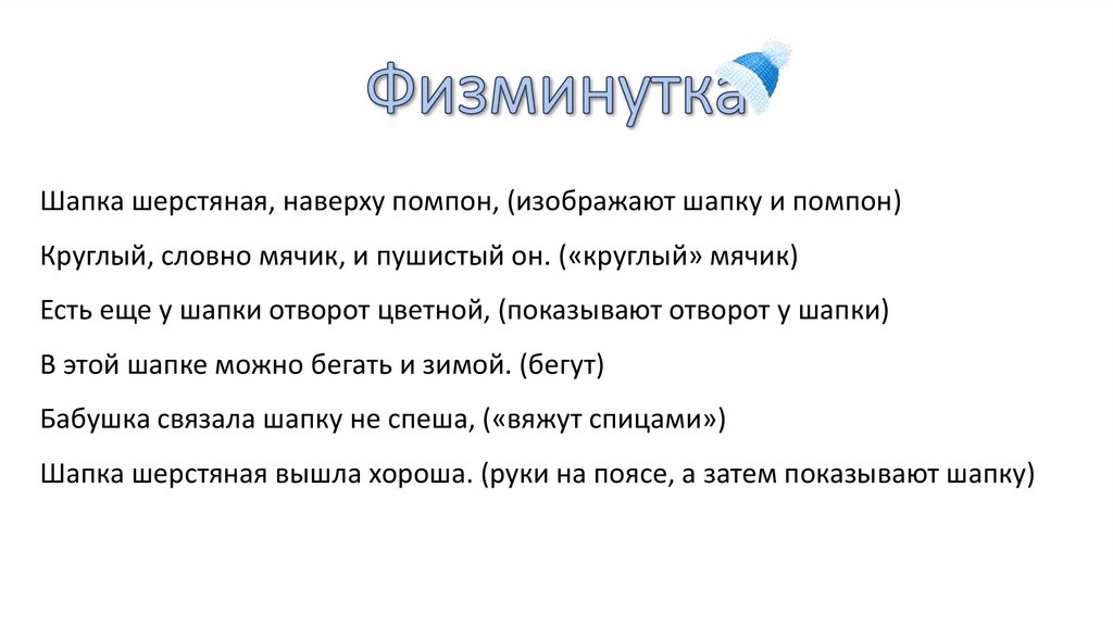 Шапка шерстяная, наверху помпон, (изображают шапку и помпон)Круглый, словно мячик, и пушистый он. («круглый» мячик)