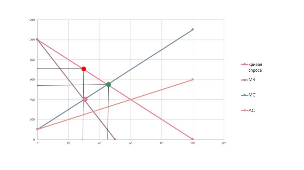 3) Для монополии построить на графике p, MR, MC, AC, указать точку оптимума