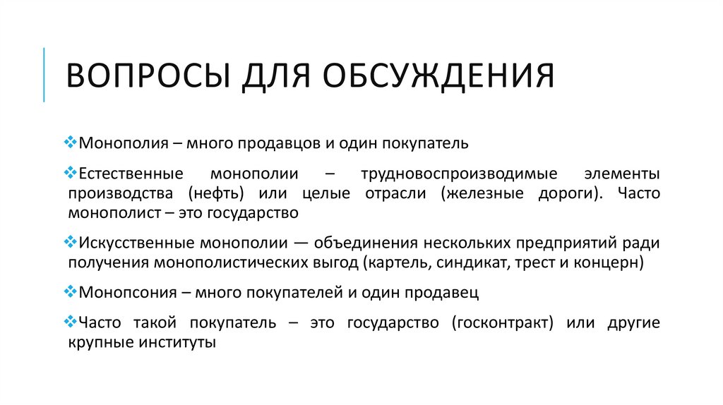 ВОПРОСЫ ДЛЯ ОБСУЖДЕНИЯМонополия – много продавцов и один покупатель