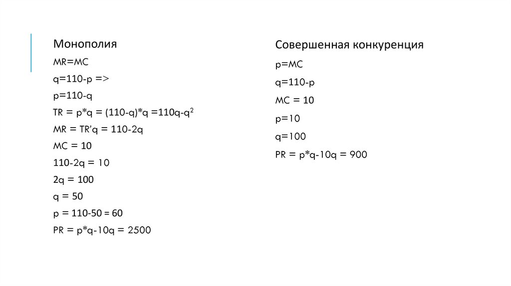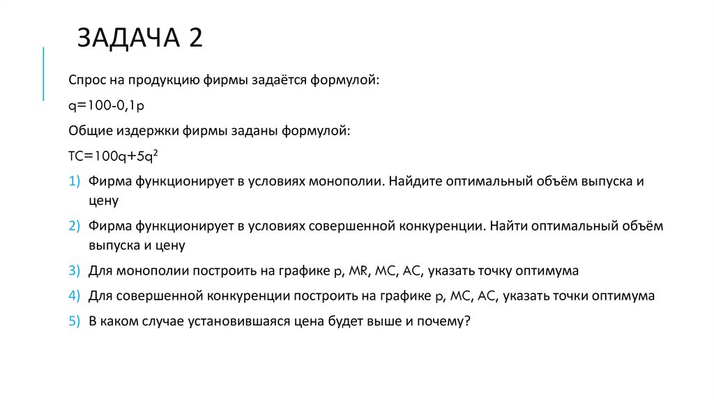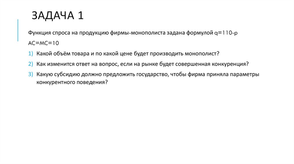 ЗАДАЧА 1Функция спроса на продукцию фирмы-монополиста задана формулой q=110-p