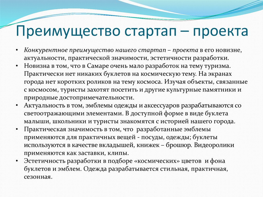Преимущество стартап – проекта• Конкурентное преимущество нашего стартап – проекта в его новизне,