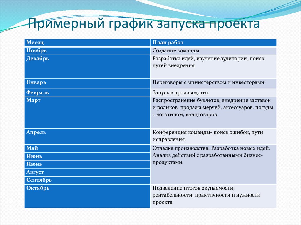 Примерный график запуска проектаМесяц
