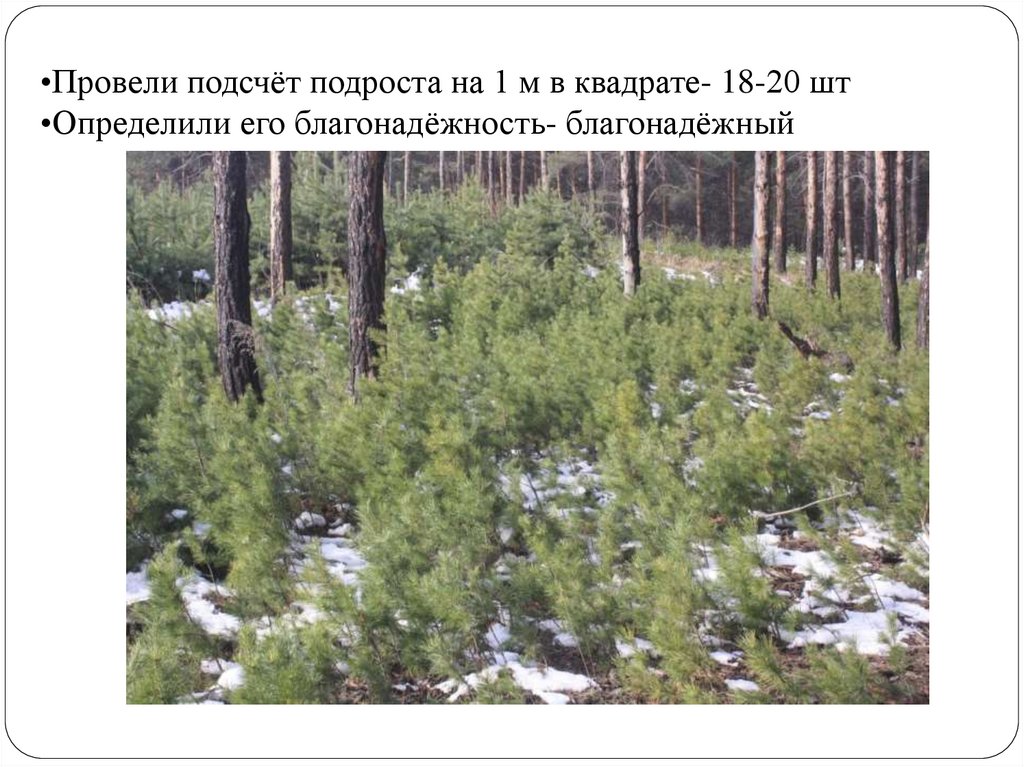 •Провели подсчёт подроста на 1 м в квадрате- 18-20 шт•Определили его благонадёжность- благонадёжный